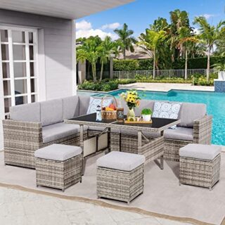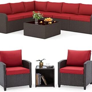 UPHYB 10-Piece Patio Furniture Set, Wicker Rattan Chairs with Glass Table, Balcony Furniture Outdoor Conversation Set for Porch, Lawn, Garden (Wine Red)