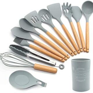Silicone Kitchen Utensils Set,13 Pcs Wooden Handles Spatula Set,Cooking Utensils for Non Stick Pans,Silicone Spatulas for Cooking Kitchen Gadgets Tools (Grey)