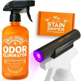 ANGRY ORANGE Pet Odor Eliminator for Strong Odor - Citrus Deodorizer for Strong Dog or Cat Pee Smells on Carpet, Furniture & Indoor Outdoor Floors - Puppy Supplies - (24 Fl Oz + UV Flashlight)